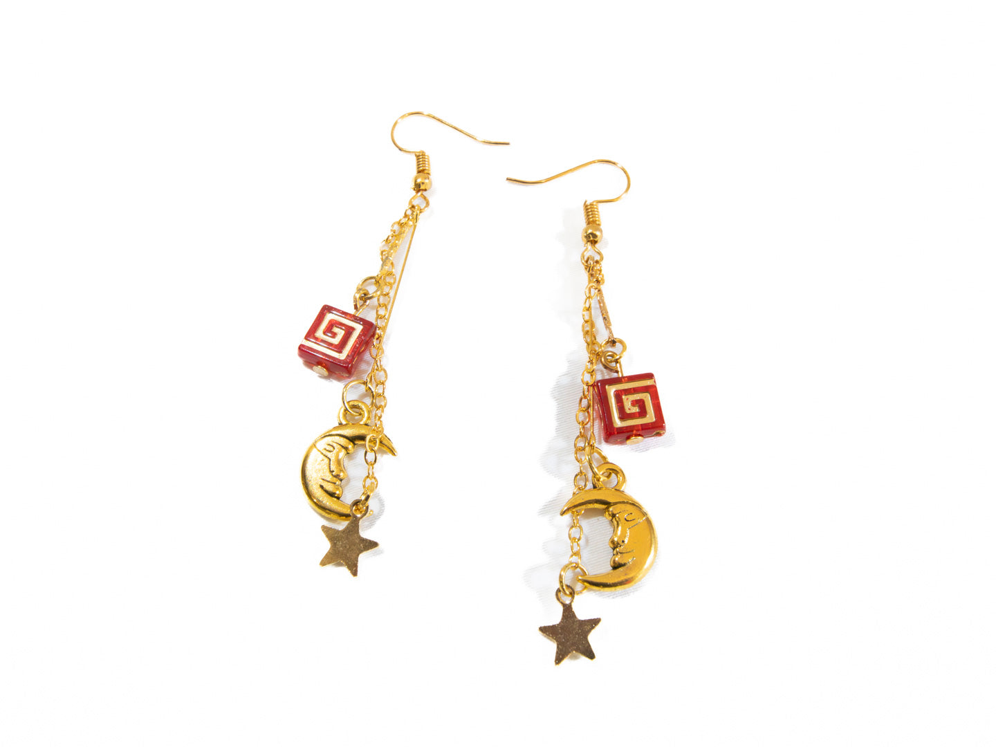 Add a touch of cosmic elegance to your look with these enchanting gold-plated dangle earrings. Featuring a delicate arrangement of celestial motifs, each earring is adorned with a serene crescent moon and a charming star suspended gracefully on fine chains. A striking red square bead with a golden spiral detail adds a bold pop of color and a hint of mystique.