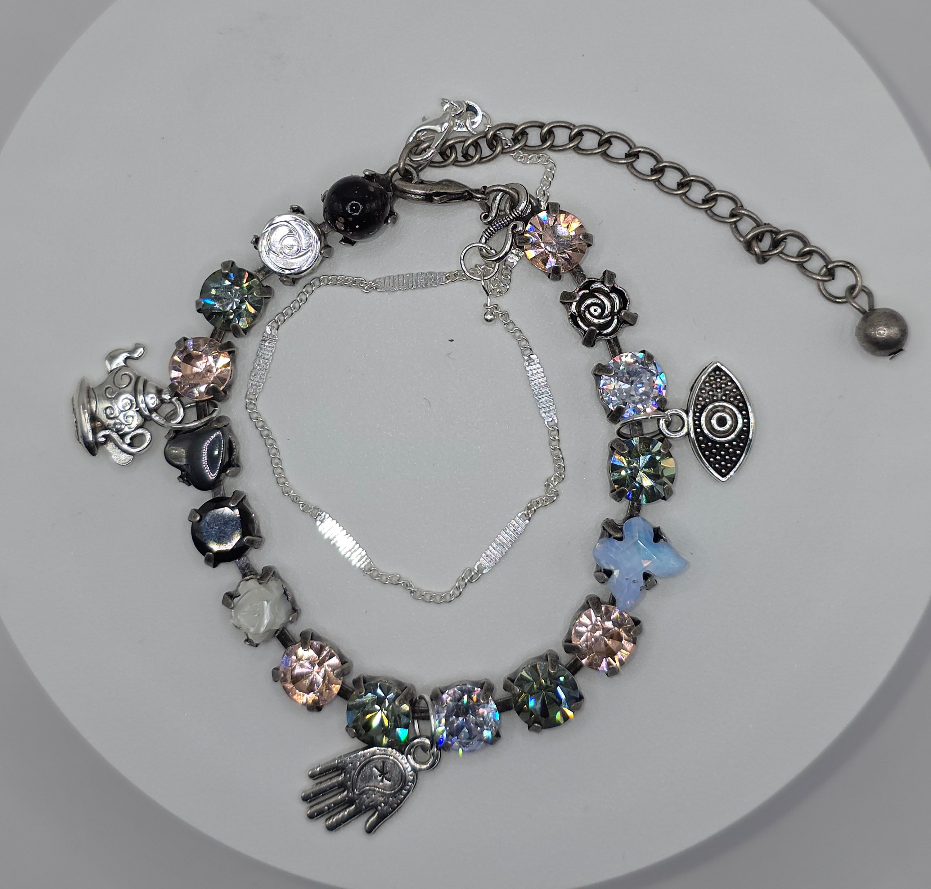 Bring a touch of mystical sparkle to your jewelry collection with this handcrafted crystal charm bracelet. Featuring a dazzling mix of Austrian crystals and cubic zirconias in shimmering shades of champagne, black, opal blue, and emerald green, this bracelet glimmers beautifully with every movement.