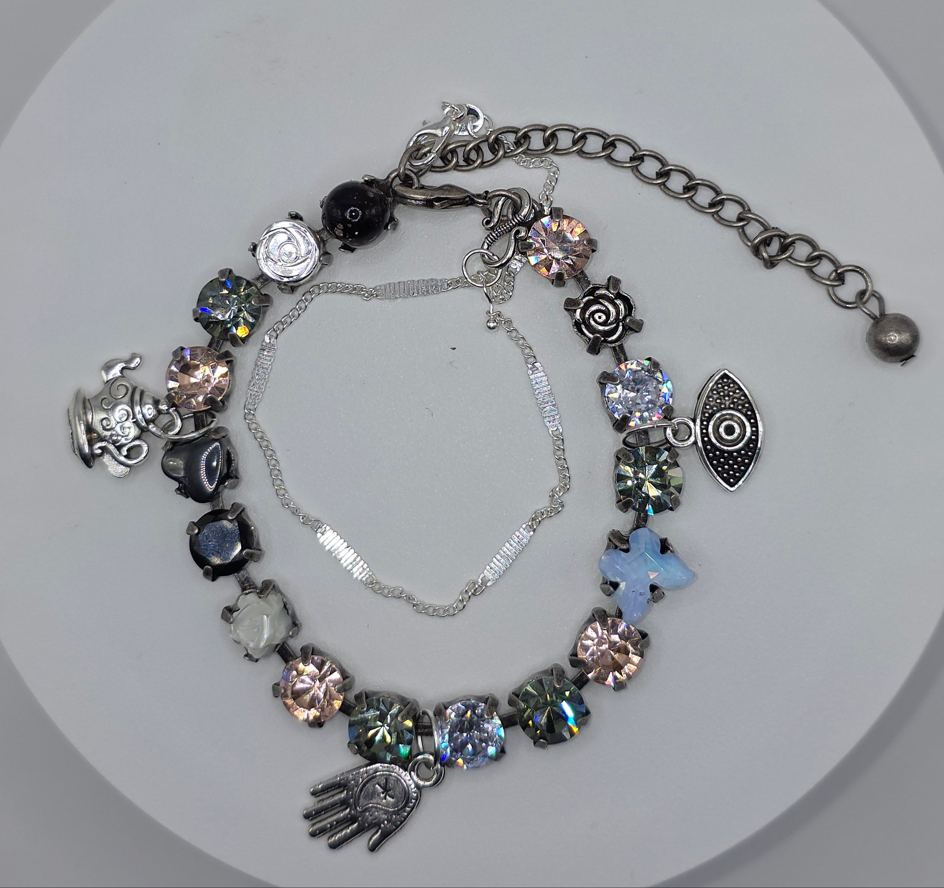 Accented with symbolic antique silver charms accented with charms full of meaning: Hamsa hand (protection), Evil Eye (warding off negativity), roses (love), and cup and teapot (stability) this bracelet combines protective motifs with whimsical elegance. Perfect for stacking with other favorites or wearing as a standout piece.