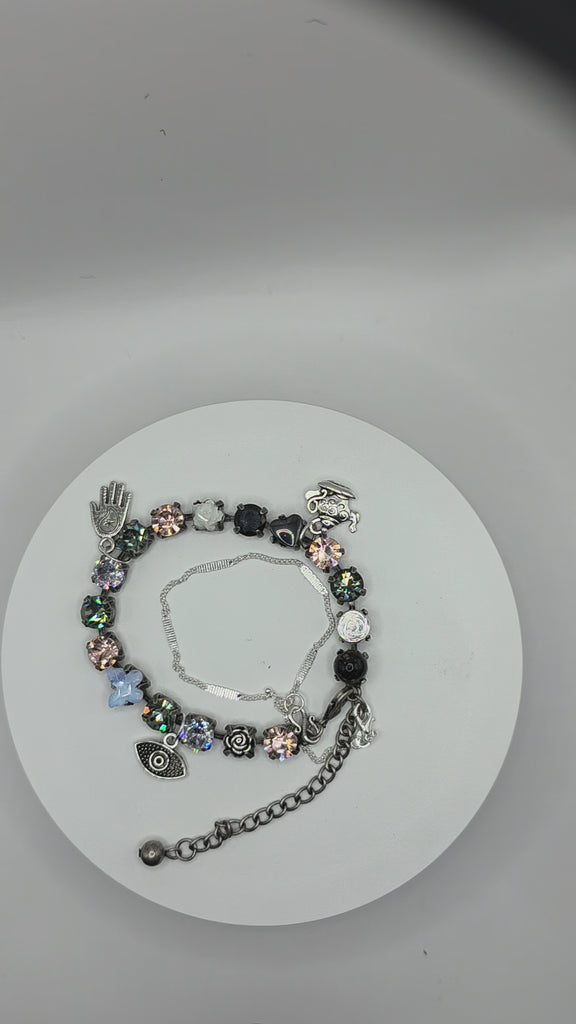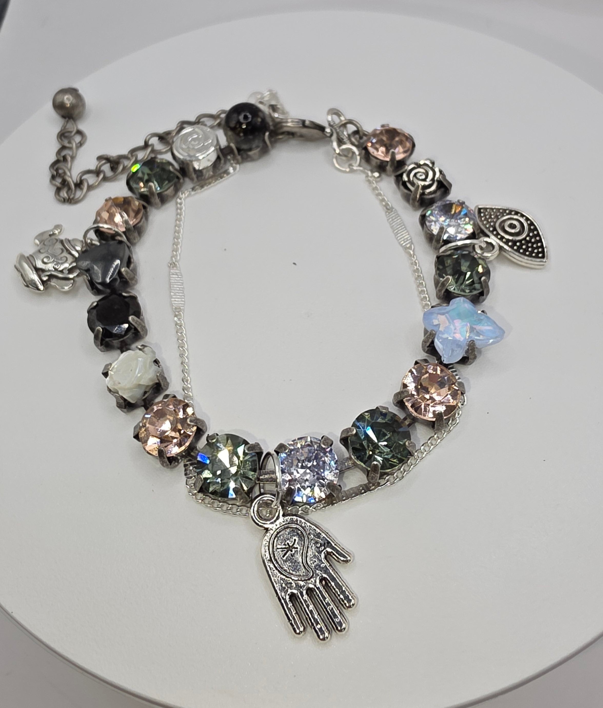 Handcrafted charm bracelet with Austrian crystals & cubic zirconias in antique silver. Features Hamsa, Evil Eye, rose & anchor charms—sparkling and symbolic