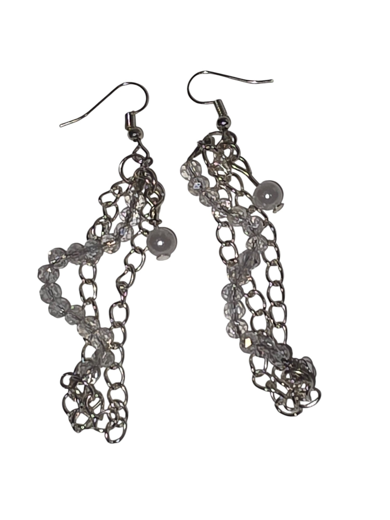 These handcrafted dangle earrings feature a graceful spiral of clear Austrian crystals intertwined with fluid silver chain, creating movement, light, and a whisper of glamor with every turn. Suspended from elegant French hooks, the design offers a modern cascade of shimmer—airy, luminous, and full of charm.
