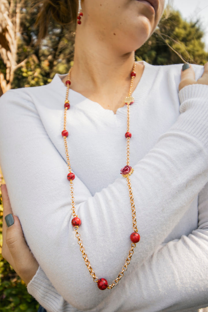 This exquisite lariat necklace (100cm length) combines timeless elegance with spiritual significance. Crafted from 18ct gold-plated chain, it features rich red jasper beads—known as a stone of strength, endurance, and grounding. Two delicate red enamel roses accent the design, symbolizing love, passion, and beauty.