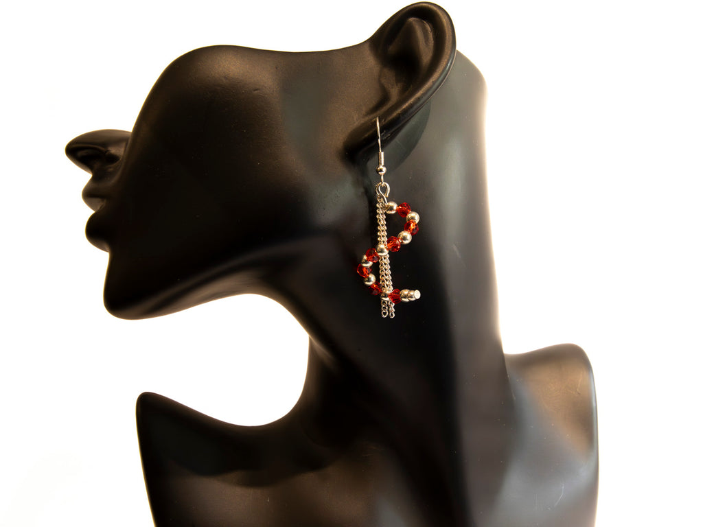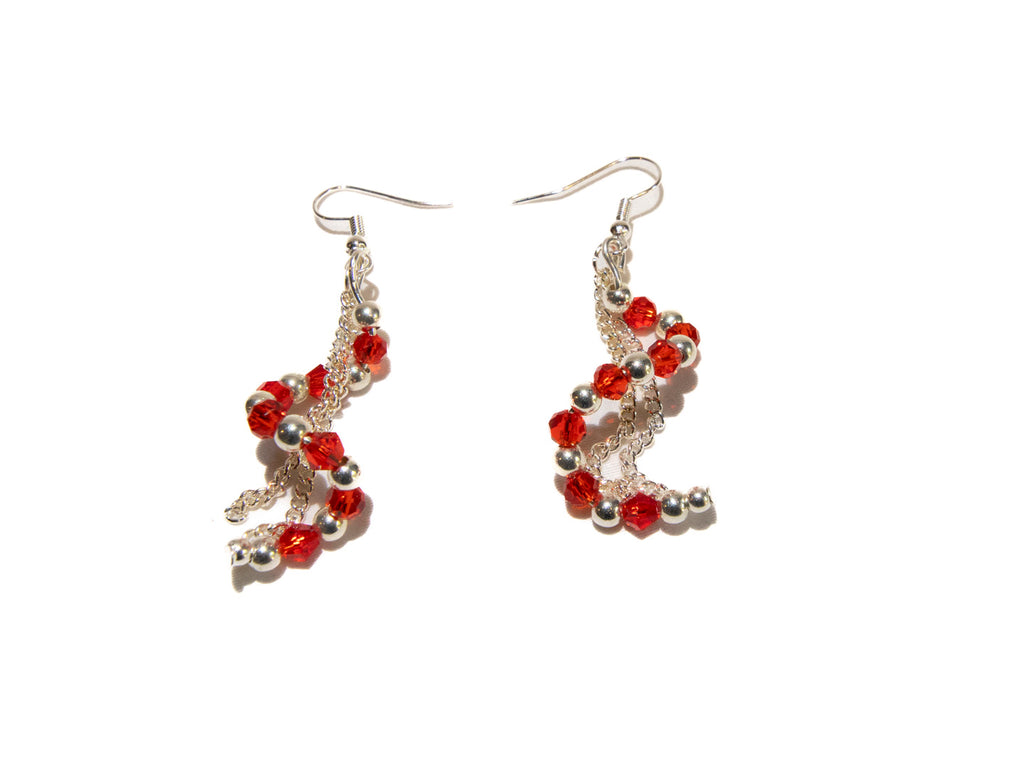 Handmade Silver Chain Earrings with Spiral Red Austrian Crystal Beads
