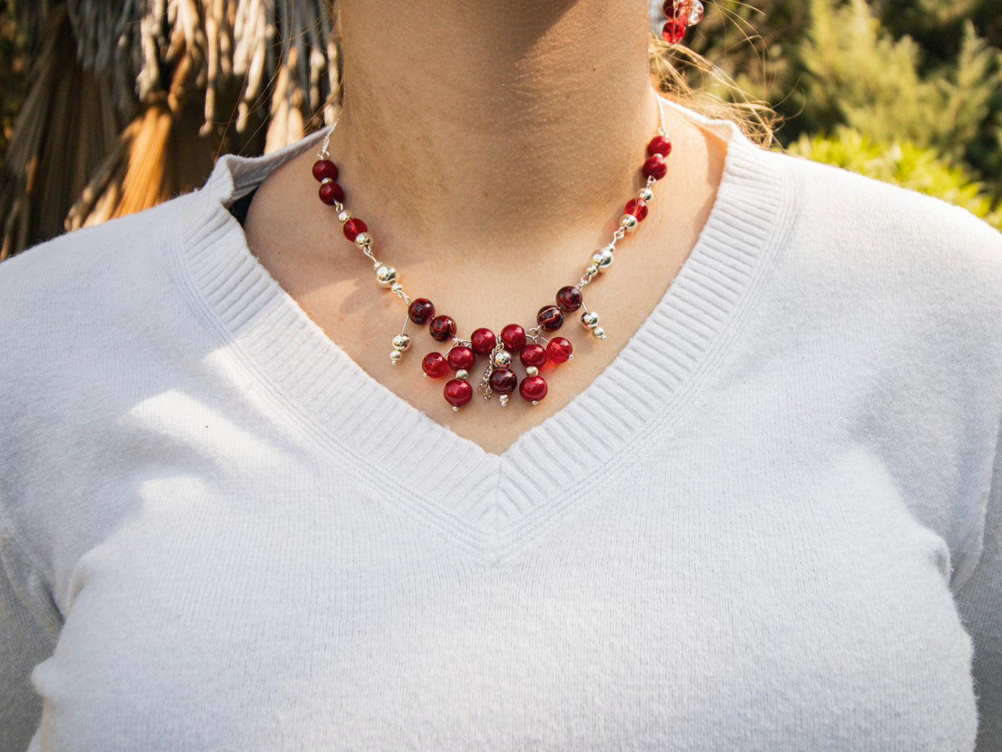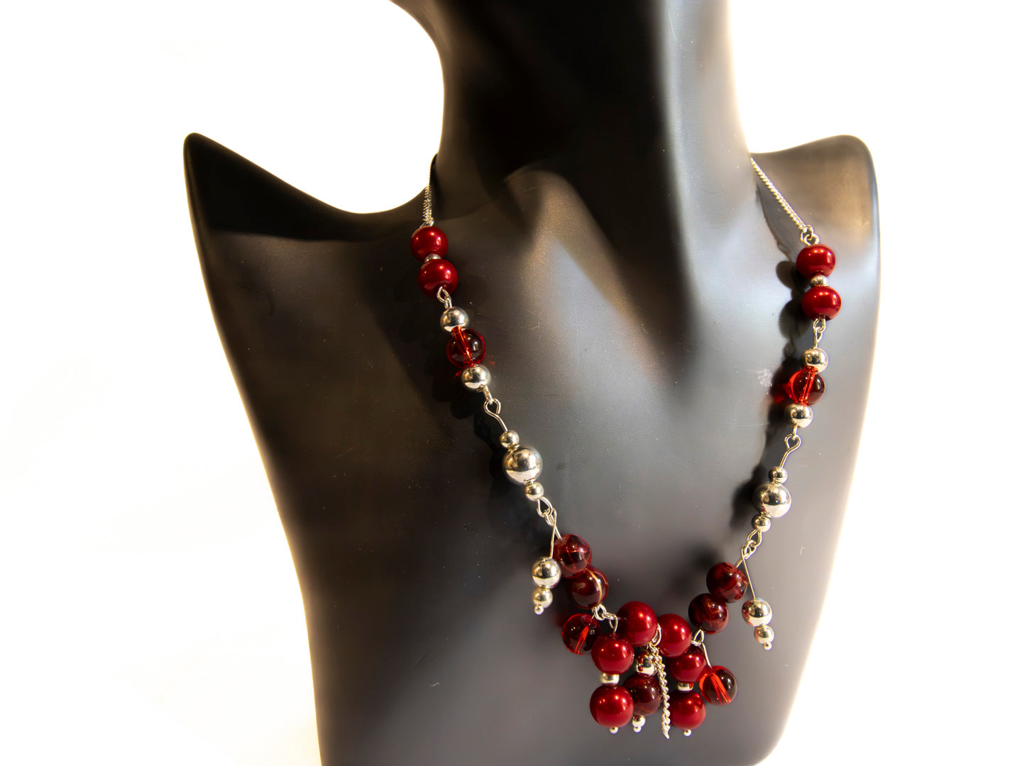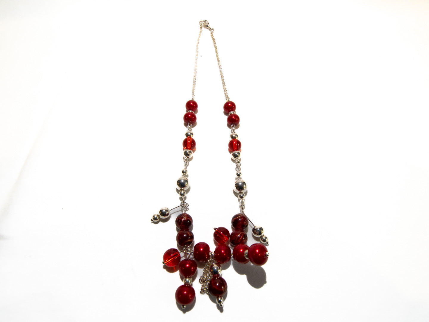 This stunning necklace features a striking combination of red and silver beads, creating a bold and elegant look. The design incorporates two strands of alternating red and silver spherical beads that meet at the bottom, where a cluster of additional red beads cascades downwards, adding a touch of drama and movement. The necklace is suspended from a delicate silver-tone chain. This piece would make a statement accessory for any special occasion, perfect for adding a pop of color and sophistication to an evening ensemble.