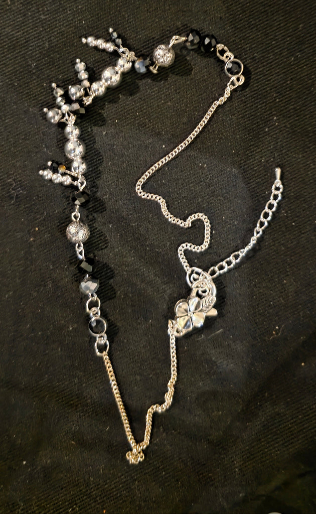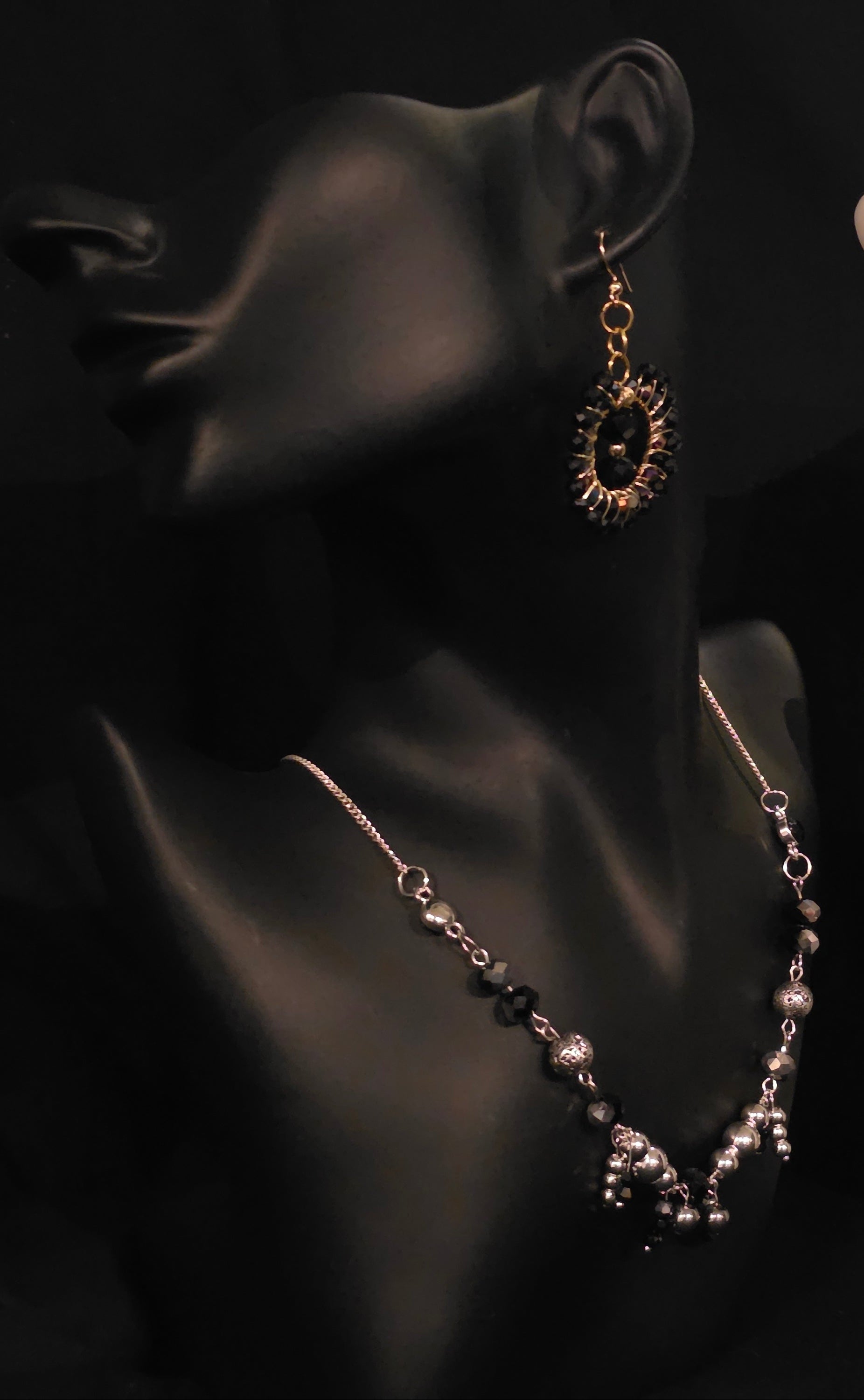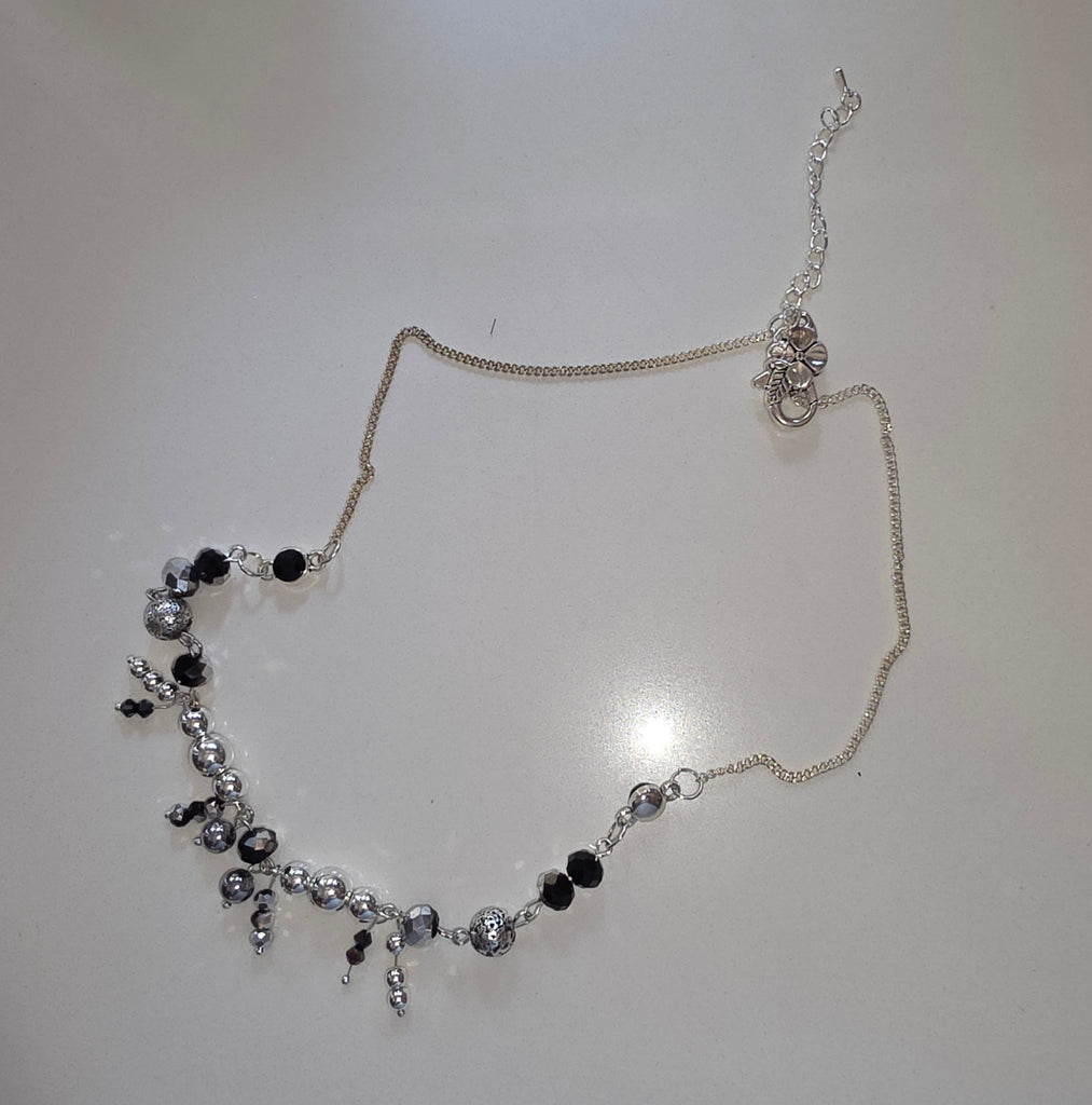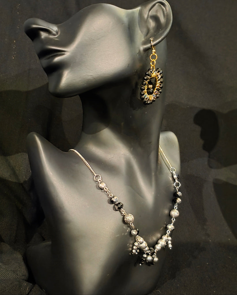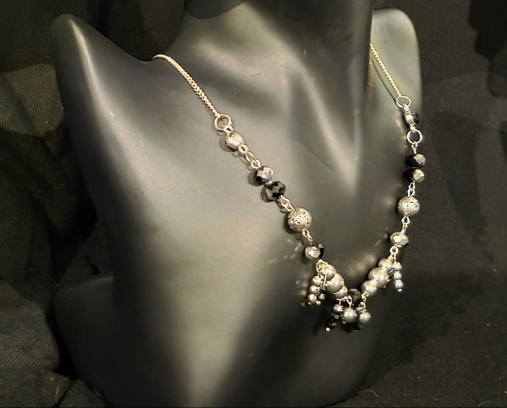 Make a bold yet graceful statement with our Princess Necklace, a perfect fusion of timeless sophistication and modern flair. This stunning piece features an artful combination of shimmering silver beads, silver-coated black lava beads, and dazzling black and silver Austrian crystals that catch the light with every movement.