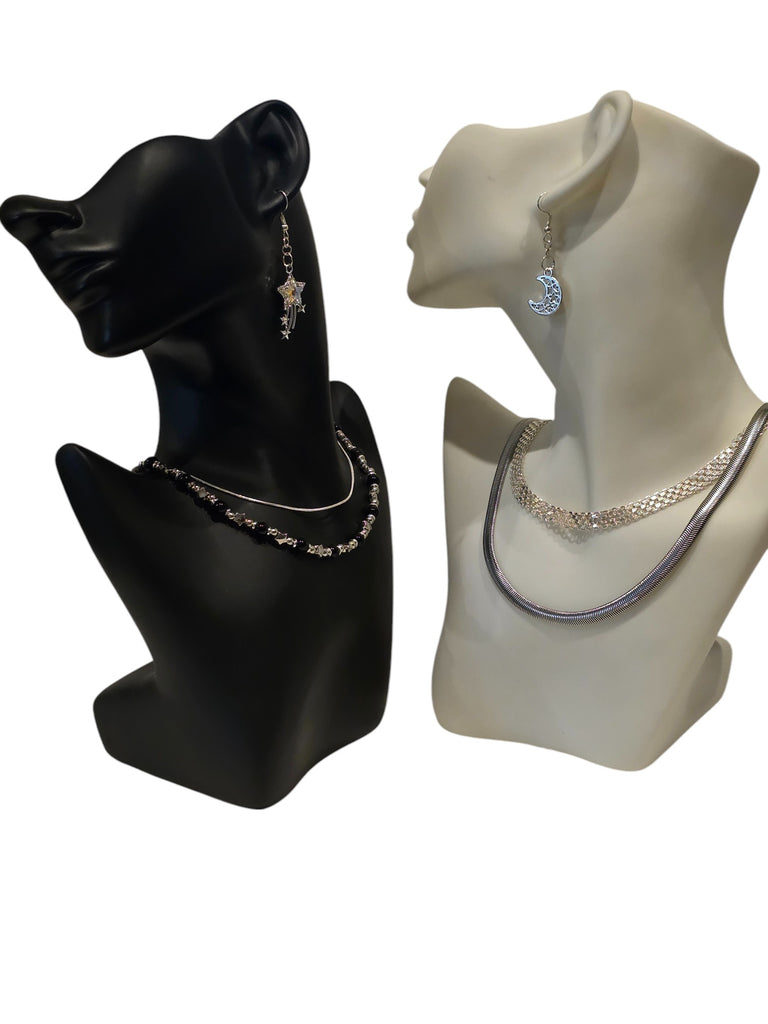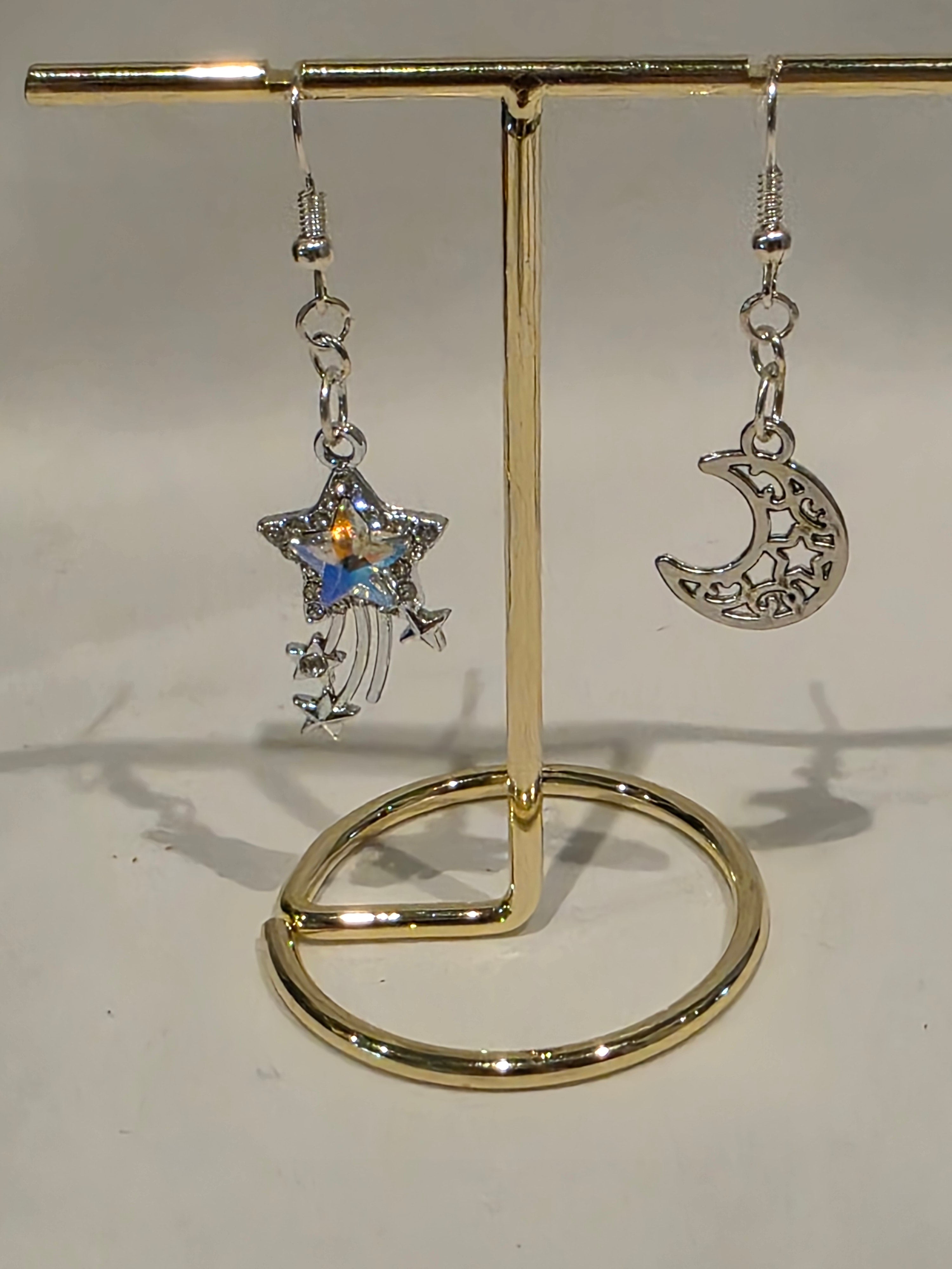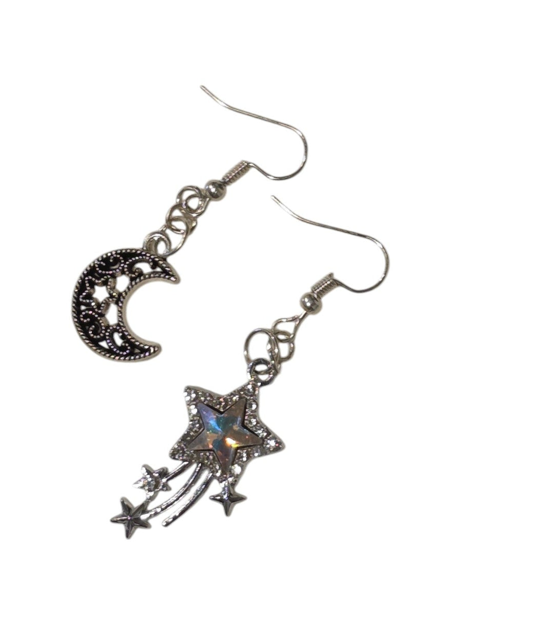 These enchanting asymmetrical earrings feature an intricate crescent moon and a radiant rhinestone star. The moon earring is delicately detailed with openwork designs and tiny accents, giving it a vintage, celestial charm. The star earring dazzles with a shimmering rhinestone center, framed by smaller stars and flowing trails that add graceful movement and sparkle. Perfect for adding a touch of whimsical elegance to any outfit, these earrings celebrate the beauty of the night sky in a uniquely stylish way.